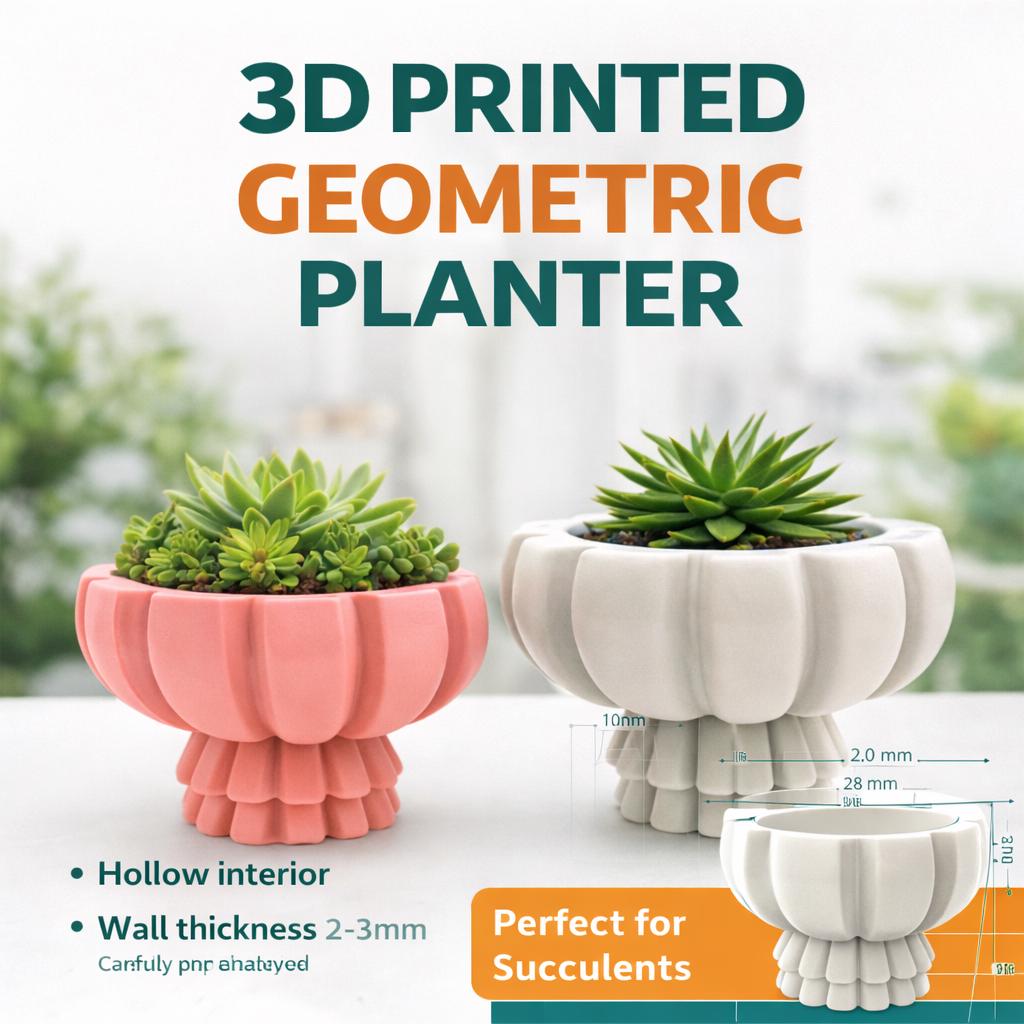 Dale un toque moderno y elegante a tu hogar u oficina con esta maceta geométrica para suculentas, diseñada especialmente para impresión 3D. El modelo cuenta con un interior hueco para ahorrar material y un grosor de pared de 2-3 mm.