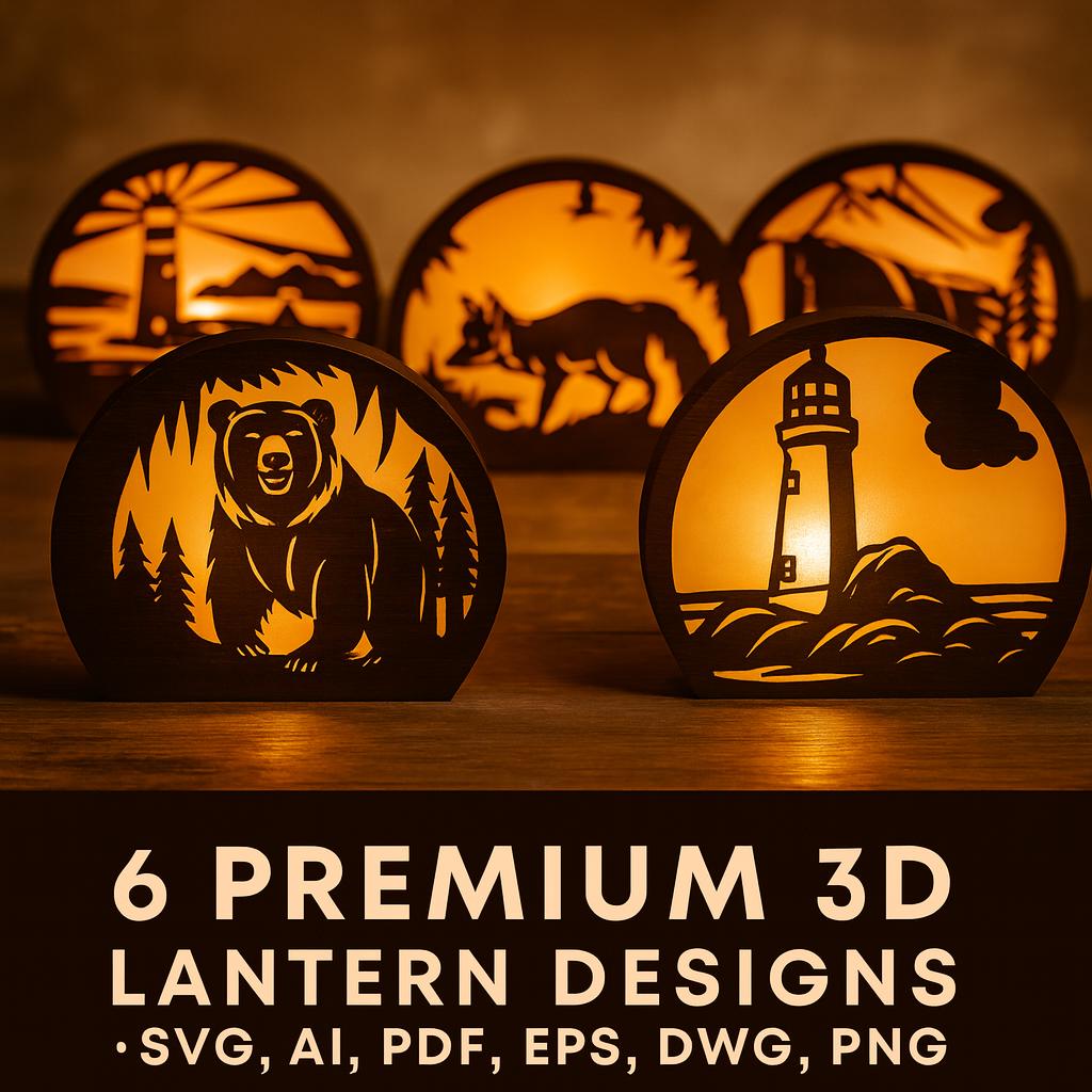 Aporta profundidad, calidez y un acabado artesanal a tus proyectos con esta colección exclusiva de seis linternas 3D en capas. Este paquete incluye tres linternas de Animales del Bosque (Zorro, Oso, Alce/Moose) y tres linternas de Faros, cada una con escenas detalladas que cobran vida al iluminarse.